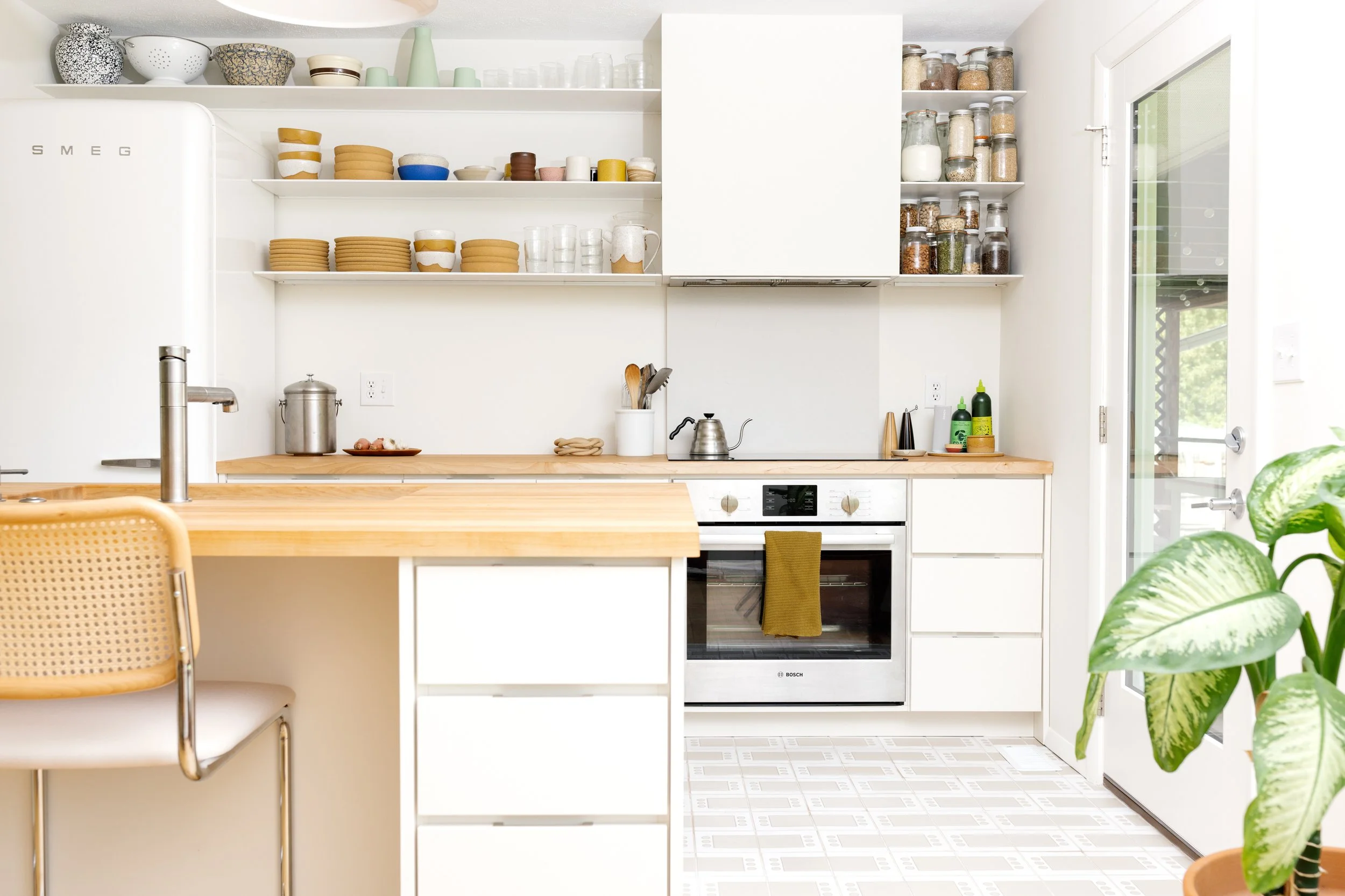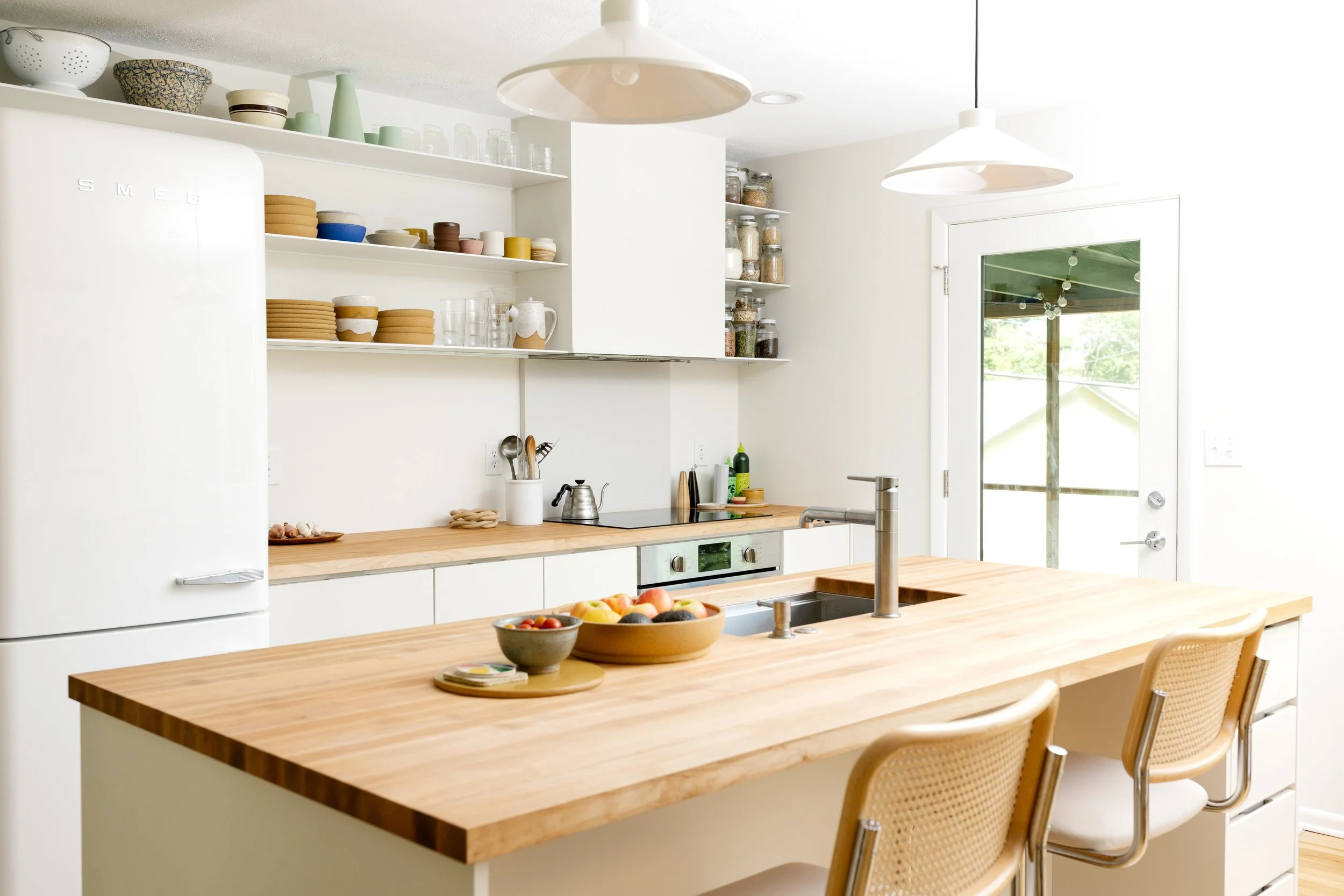 Focused on uniting segmented spaces, amplifying natural light, and upgrading overall aesthetics and functionality, MINOH employed a palette of bright, white elements, including cabinetry, shelving and appliances. Complemented by the warmth of butcher block counters, earthy-toned tiles, larger windows and integrated overhead lighting, the result is a much improved fusion of contemporary design and organic influences.